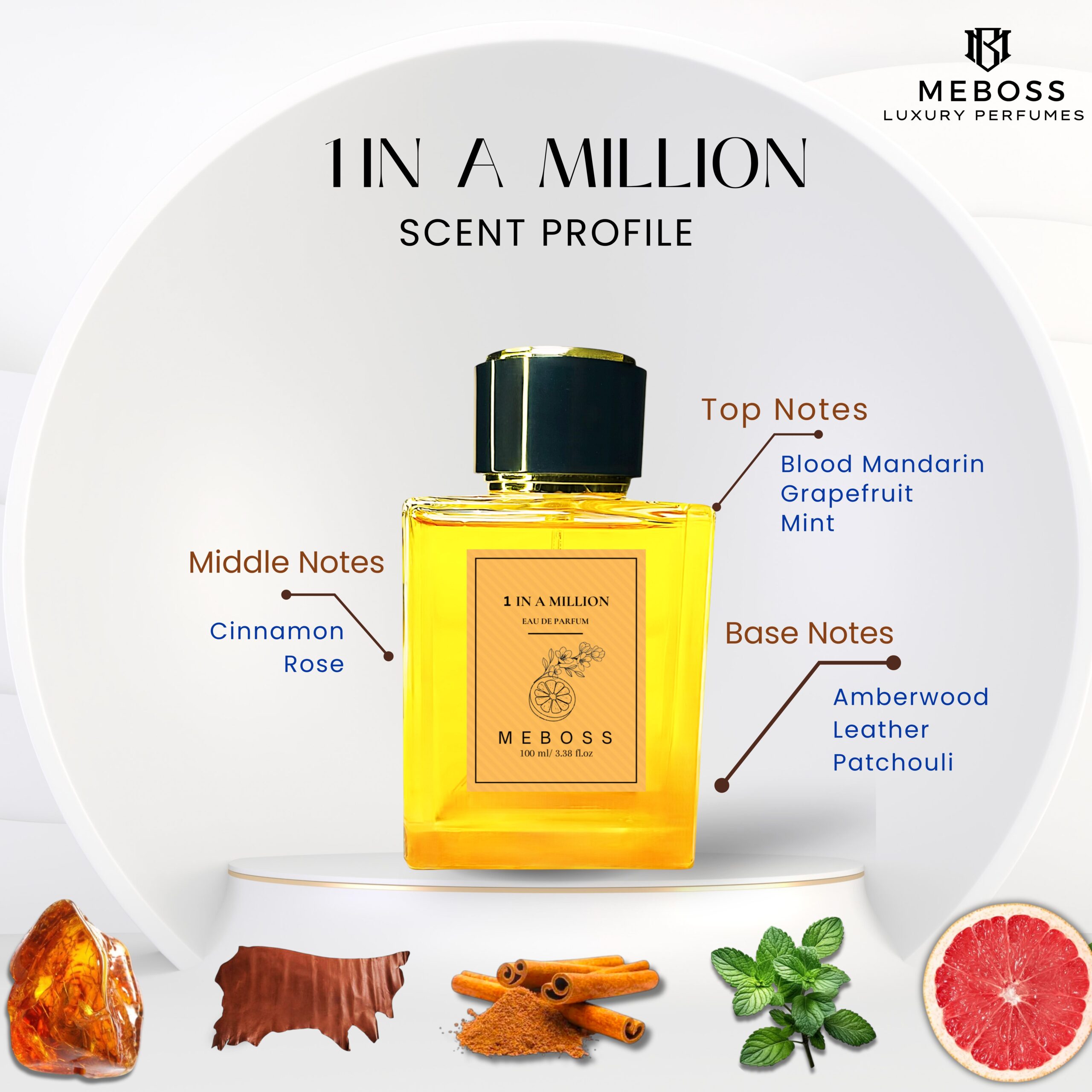 • Scent Notes: Top Notes : Blood Mandarin, Grapefruit, Mint – Middle Notes : Cinnamon, Spicy Notes, Rose – Base Note : Amberwood, Leather, Woody Notes, Indian Patchouli.
