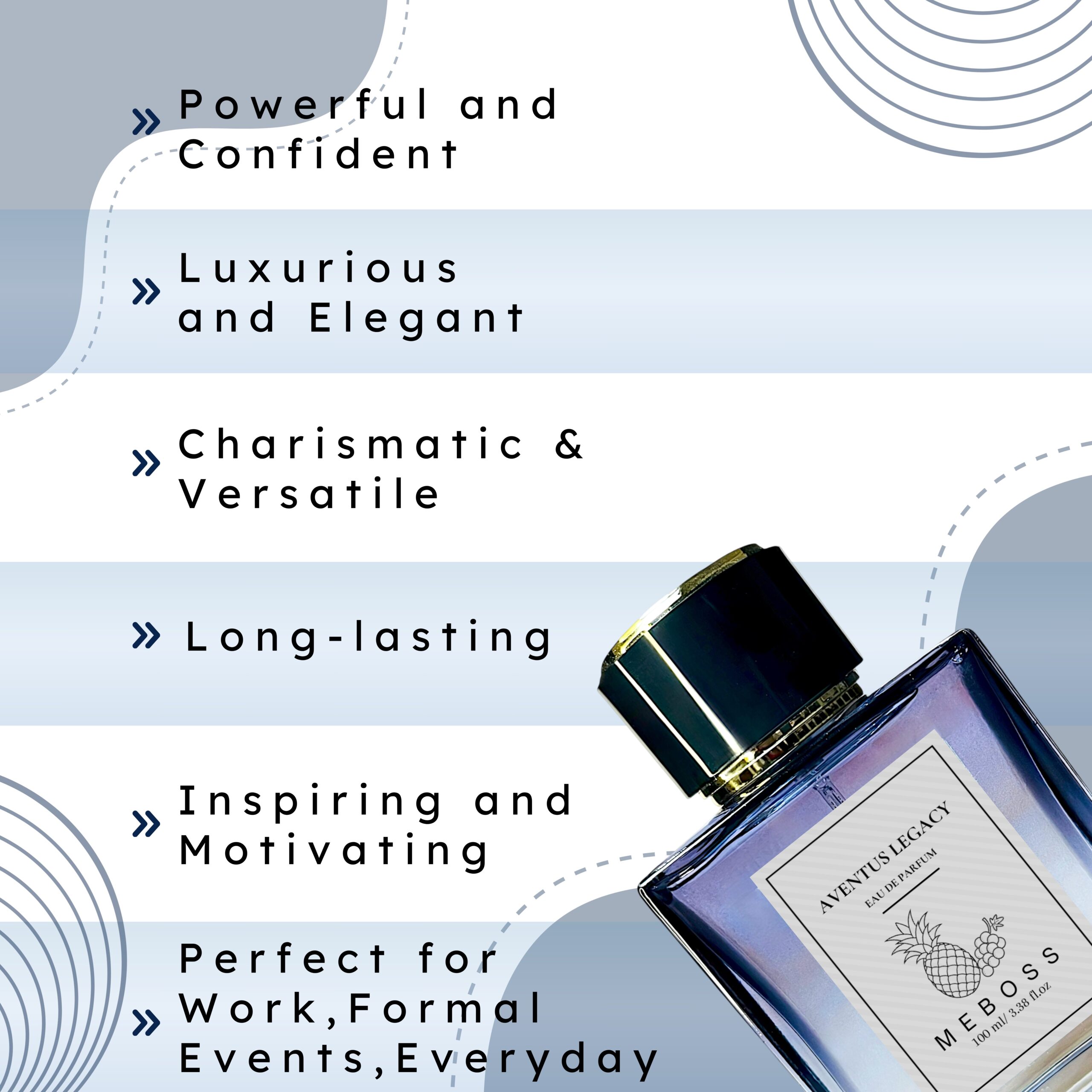 Aventus Legacy is a luxurious, sophisticated fragrance that embodies the essence of success and elegance. This complex scent combines notes of pineapple, bergamot, and blackcurrant with a smoky, woody base of patchouli, vetiver, and musk, creating a rich, fruity aroma with a subtle smokiness. It is characterized by its impressive longevity and moderate sillage, making it perfect for special occasions or business settings. With its bold, confident character, this fragrance is designed for individuals who appreciate luxury, sophistication, and a hint of adventure, exuding a sense of power, refinement, and distinction.