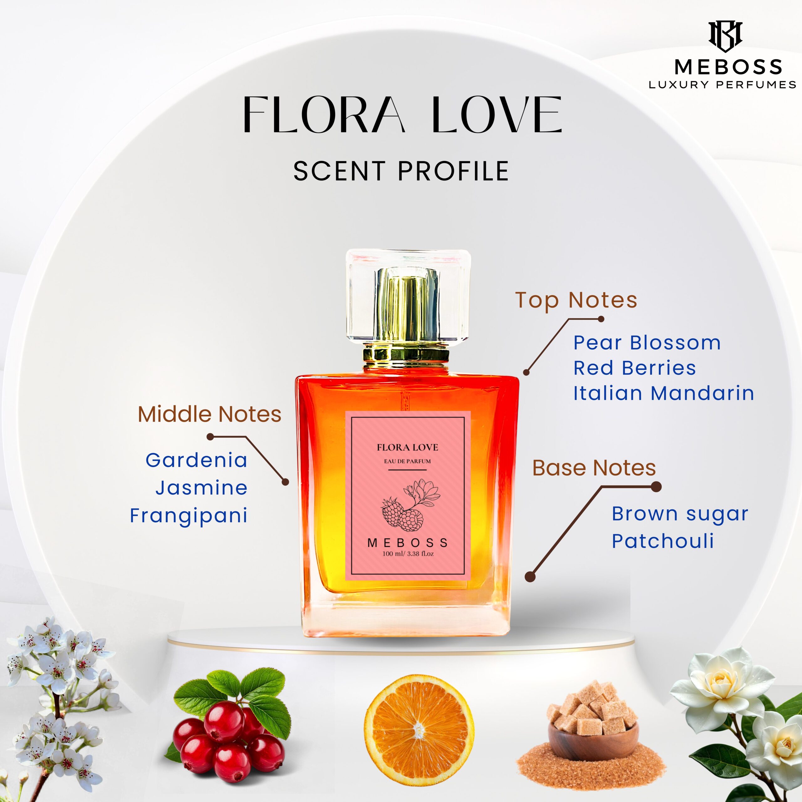 Flora Love Eau de Parfum is a joyful, floral fragrance designed for the modern woman. This scent combines the elegance of white gardenia with the sweetness of pear blossom and brown sugar, creating a delightful aroma that’s both sophisticated and playful. With top notes of pear blossom, Italian mandarin, and red berries, middle notes of white gardenia, jasmine absolute, and frangipani flower, and base notes of patchouli and brown sugar accord, this fragrance is perfect for women who exude confidence and positivity.