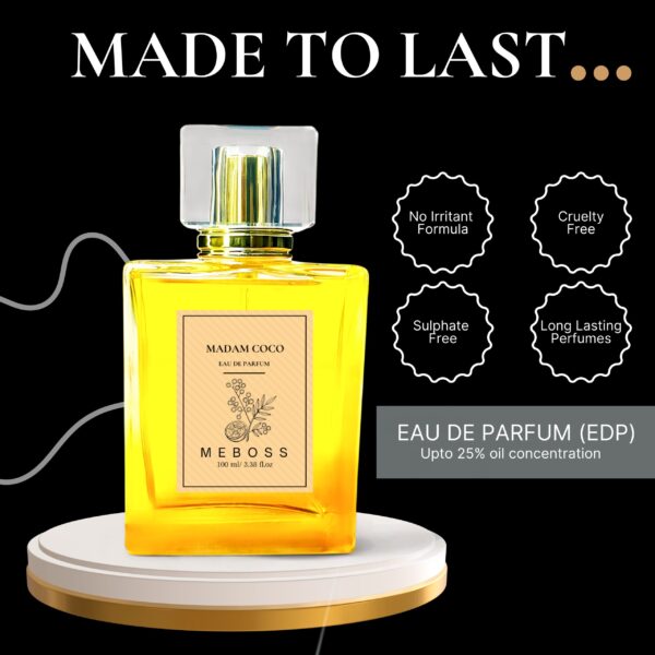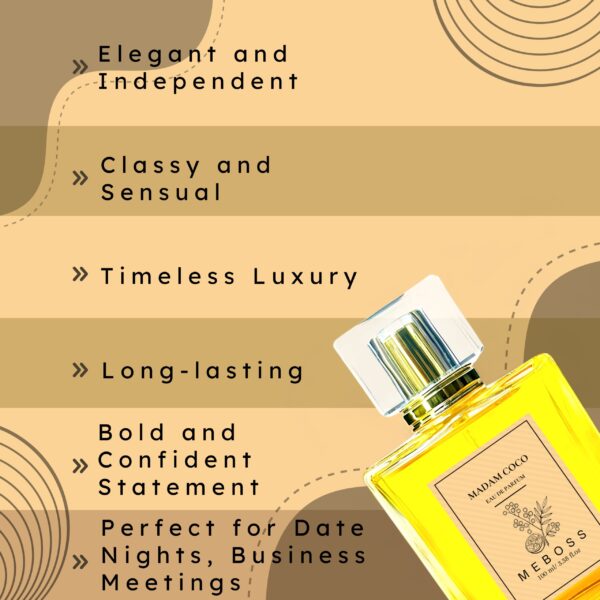 Madam Coco is a vibrant, modern fragrance that embodies the essence of youthful femininity. This energetic scent combines notes of mandarin, patchouli, and vetiver, with a bouquet of jasmine and rose, creating a fresh, playful aroma. The fragrance is characterized by its bright citrus notes and a warm, woody base, making it perfect for everyday wear, especially during spring and summer. It is designed for the confident, independent woman who embodies a carefree spirit and a modern lifestyle, exuding a sense of freedom and joy. With its moderate longevity and sillage, this perfume is suitable for various occasions, from casual outings to office settings.