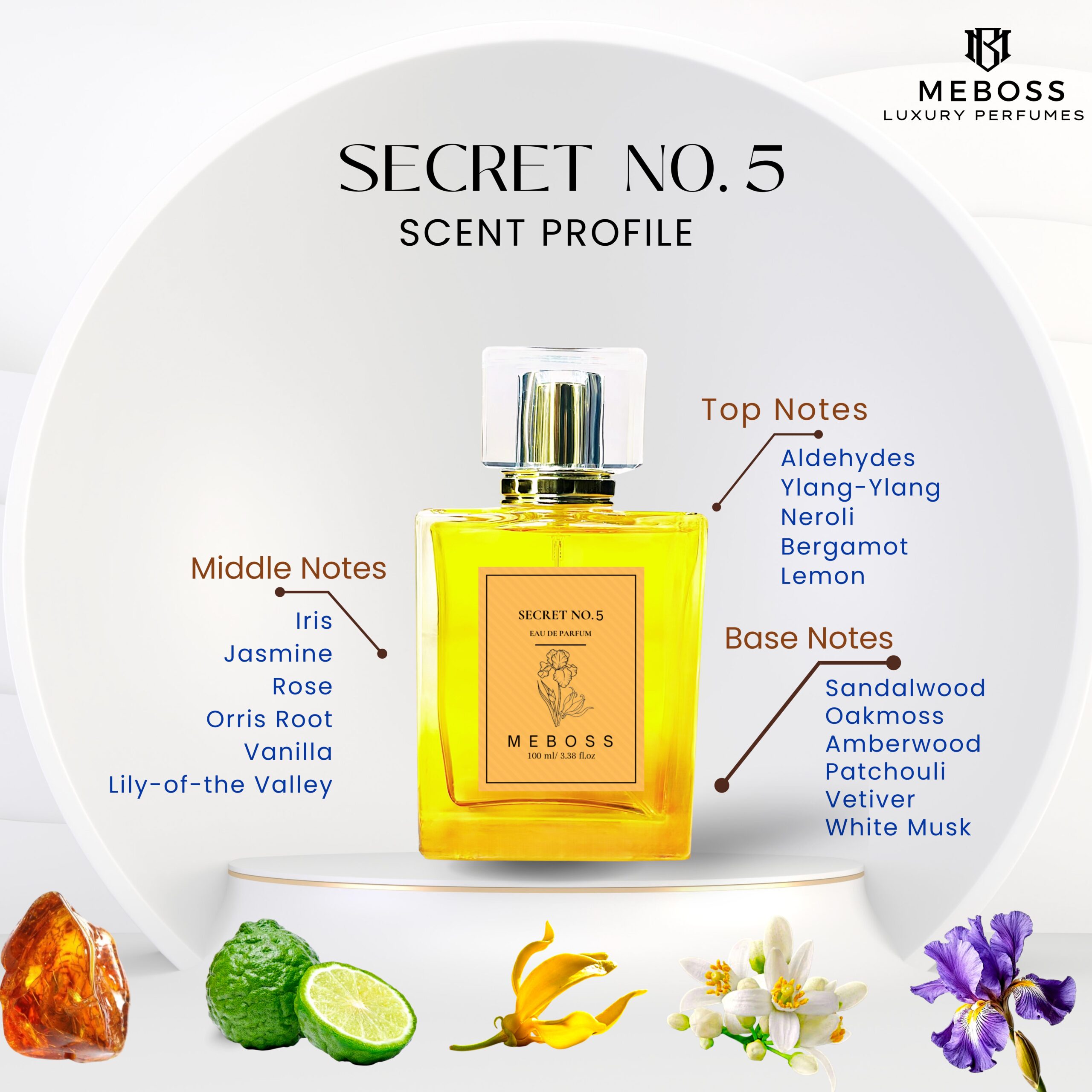 Secret No.5  is a timeless, iconic fragrance that embodies the essence of luxury and sophistication. This complex, abstract scent combines over 80 ingredients, featuring notes of jasmine, rose, sandalwood, and vanilla, blended with aldehydes that create a rich, velvety texture. The result is a perfume that’s both feminine and powerful, evoking the modern woman. With its impressive longevity and subtle sillage, it  is perfect for evening wear or special occasions, exuding elegance, refinement, and glamour. It inspire and influence the world of perfumery, making it a coveted treasure for those who appreciate classic beauty.