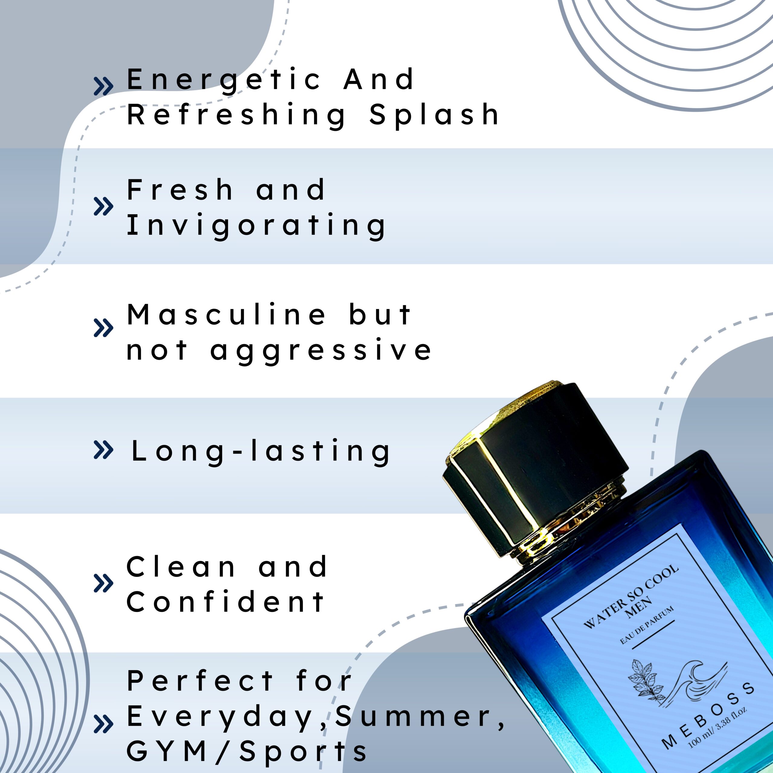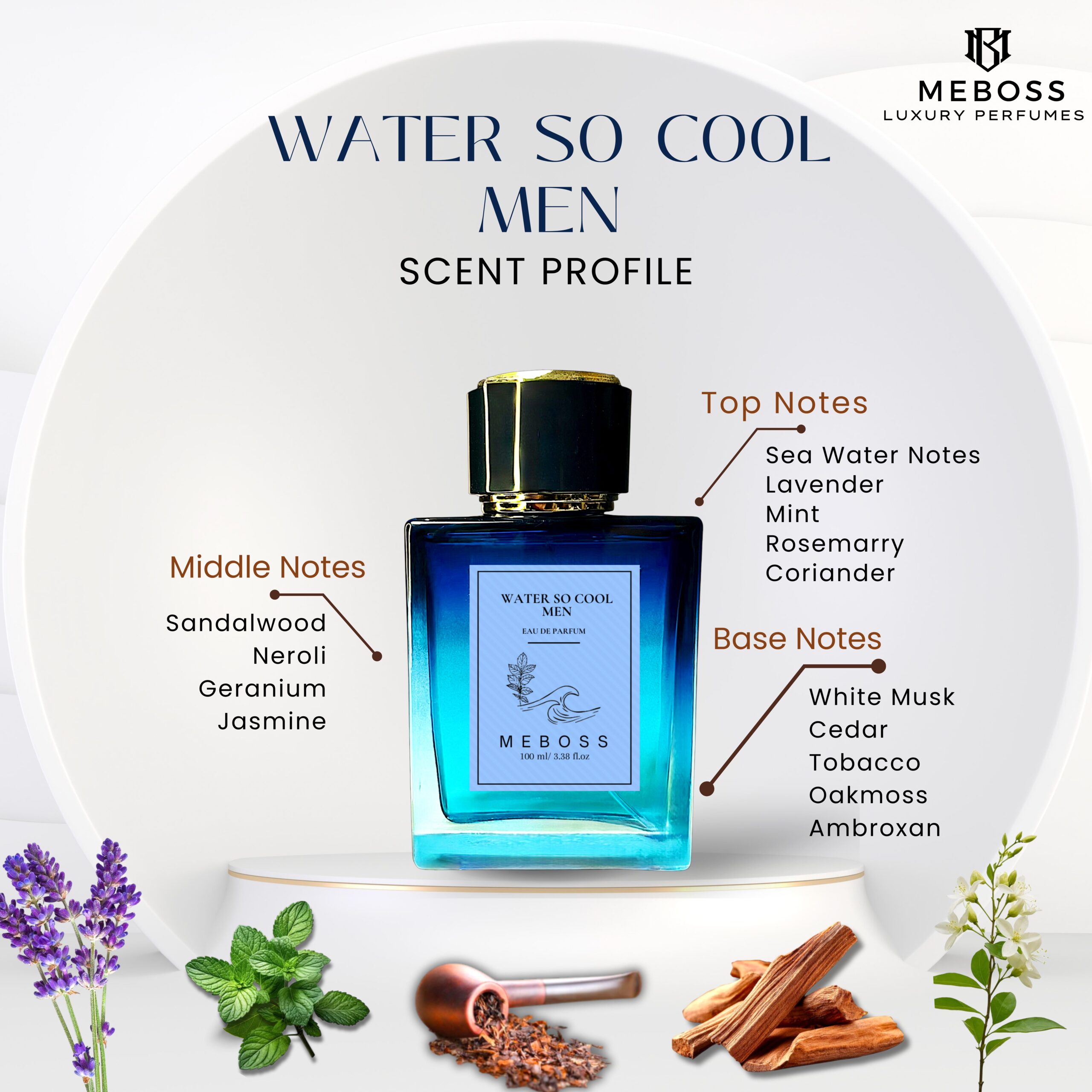 Water so Cool Men is a refreshing, aquatic fragrance designed for the modern man. The scent combines top notes of mint, lavender, and coriander with a heart of jasmine, sandalwood, and geranium, resting on a base of long-lasting musk, tobacco, and oakmoss.It is characterized by its crisp, aquatic aroma, evoking the freshness of the ocean. With its moderate longevity and sillage, this fragrance is perfect for everyday wear, especially during summer. Its versatility and affordability make it a popular choice for men who appreciate a clean, energetic scent without being overpowering.